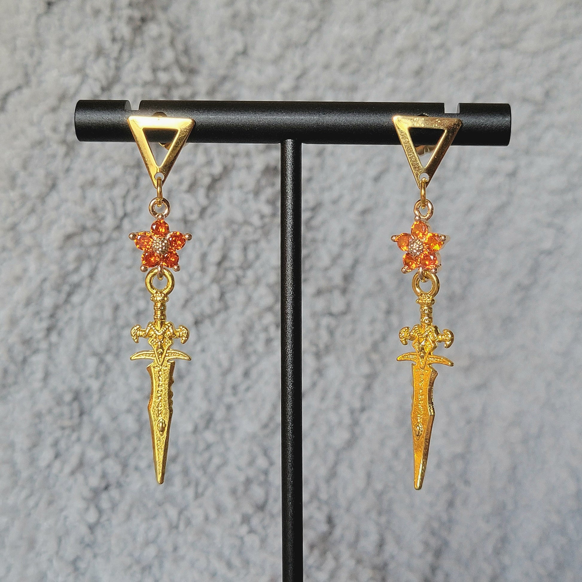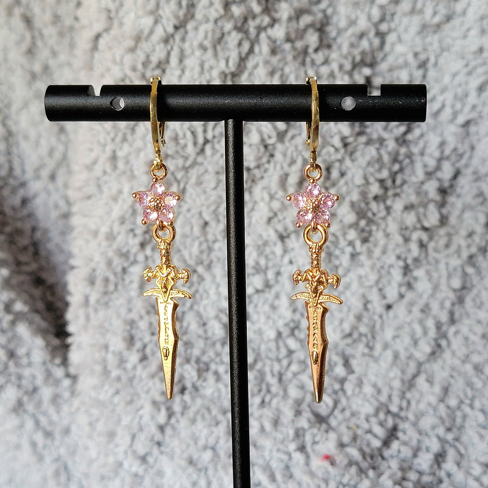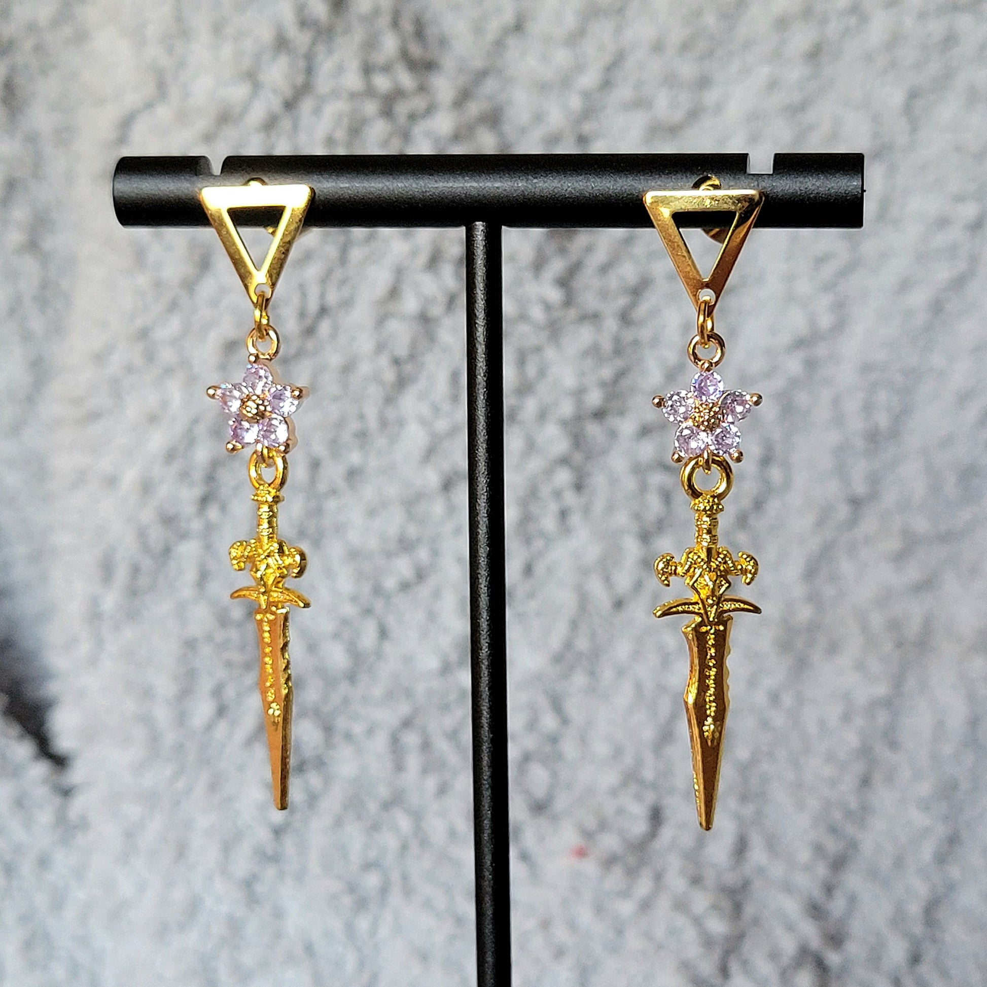 18k plated brass leverback hoops or triangle posts with a cubic zirconia flower over a gold dagger charm.