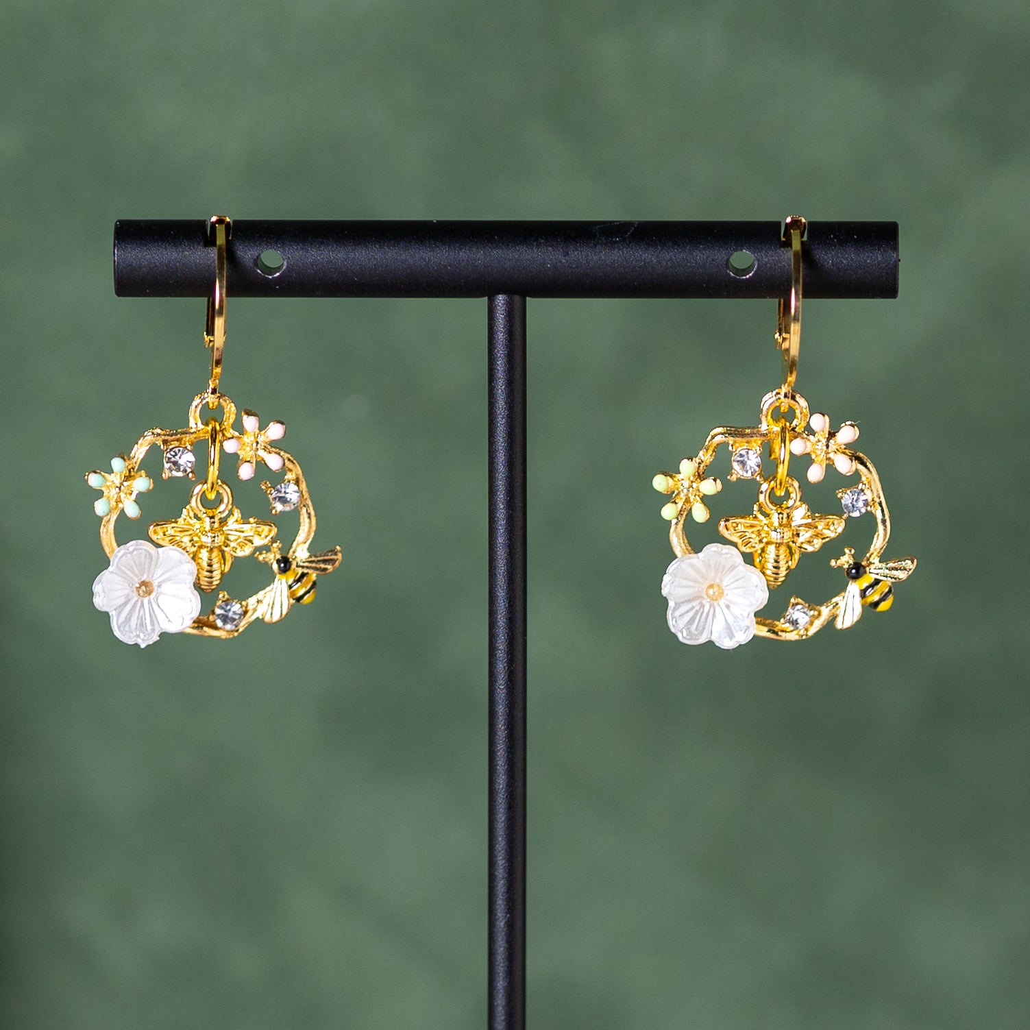 Perfect for springtime, these earrings are sure to make bees come knocking on your door! 18k gold plated brass Leverbacks with a bee charm encircled by a white, floral wreath.