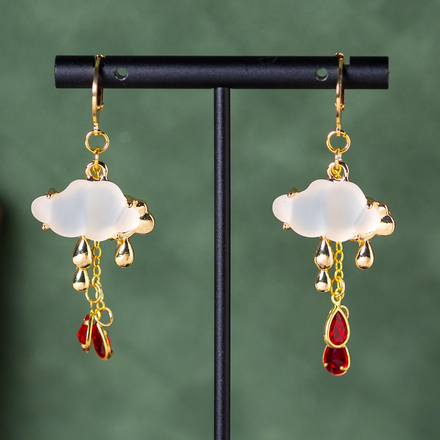 Moody and mysterious, these clouds rain blood. Whose blood? We'll let you be the judge of that. 18k gold-plated brass with blood red cubic zirconia raindrops falling out of soft clouds.
