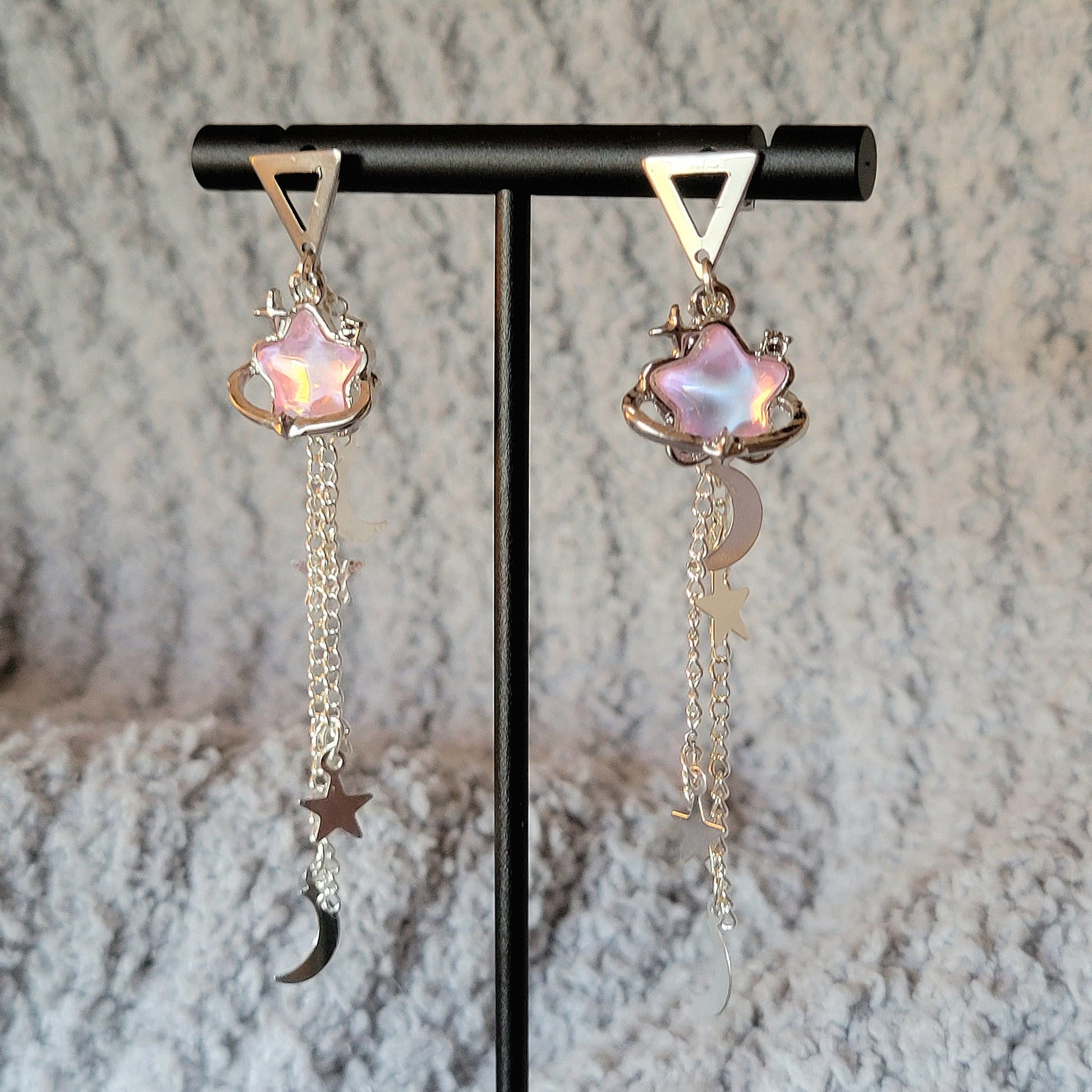 (Silver) Stainless steel triangle posts with powdered pink star charms followed by silver celestial chain.