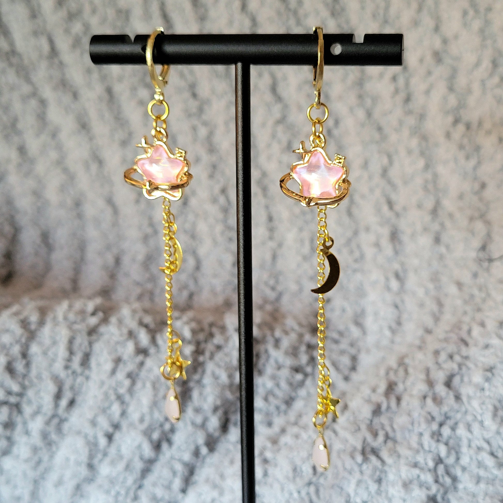 (Gold) 18k gold plated brass leverback hoops with powdered pink star charms followed by gold celestial chain.
