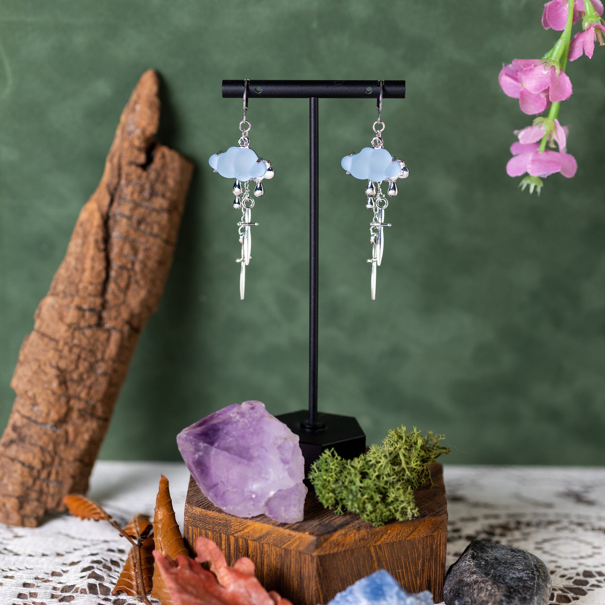 Stainless steel leverback hooks with stainless steel daggers falling out of baby blue clouds.