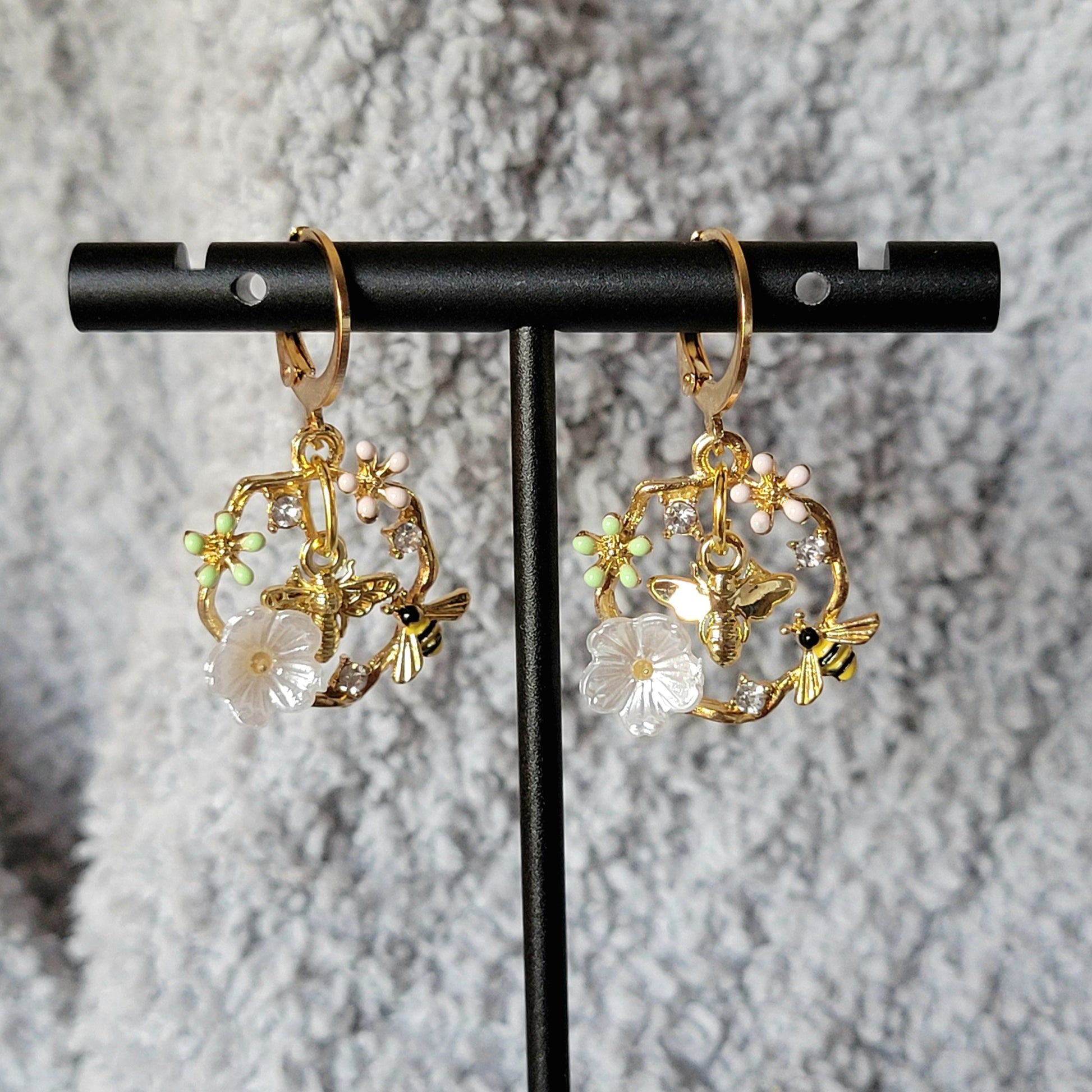 Leverback Hoops or brass posts made of 18k gold plated brass, attached to a mini bee charm within a floral wreath. Comes in pink or white!