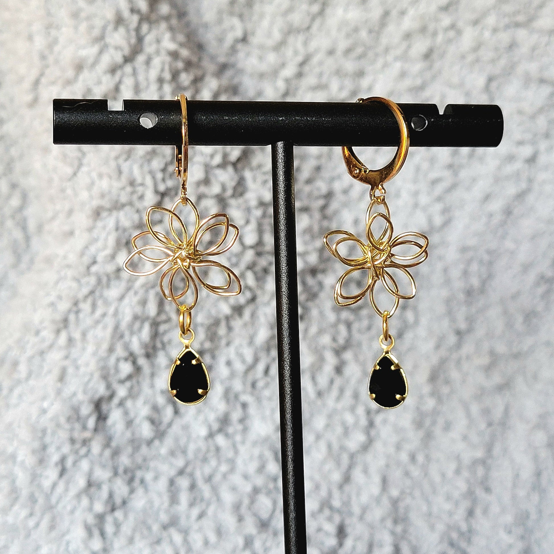 18k gold plated brass leverback hoops with gold wire flower charms, followed by a black teardrop gem.