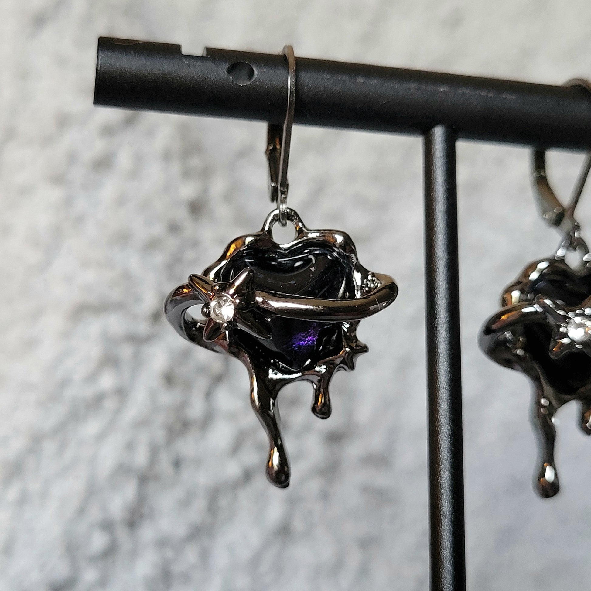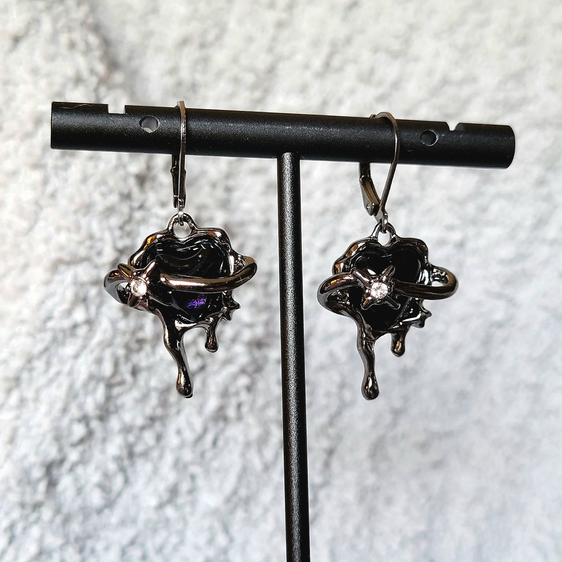 Black: Stainless steel leverback hoops with iridescent black/purple heart surrounded by melting steel.