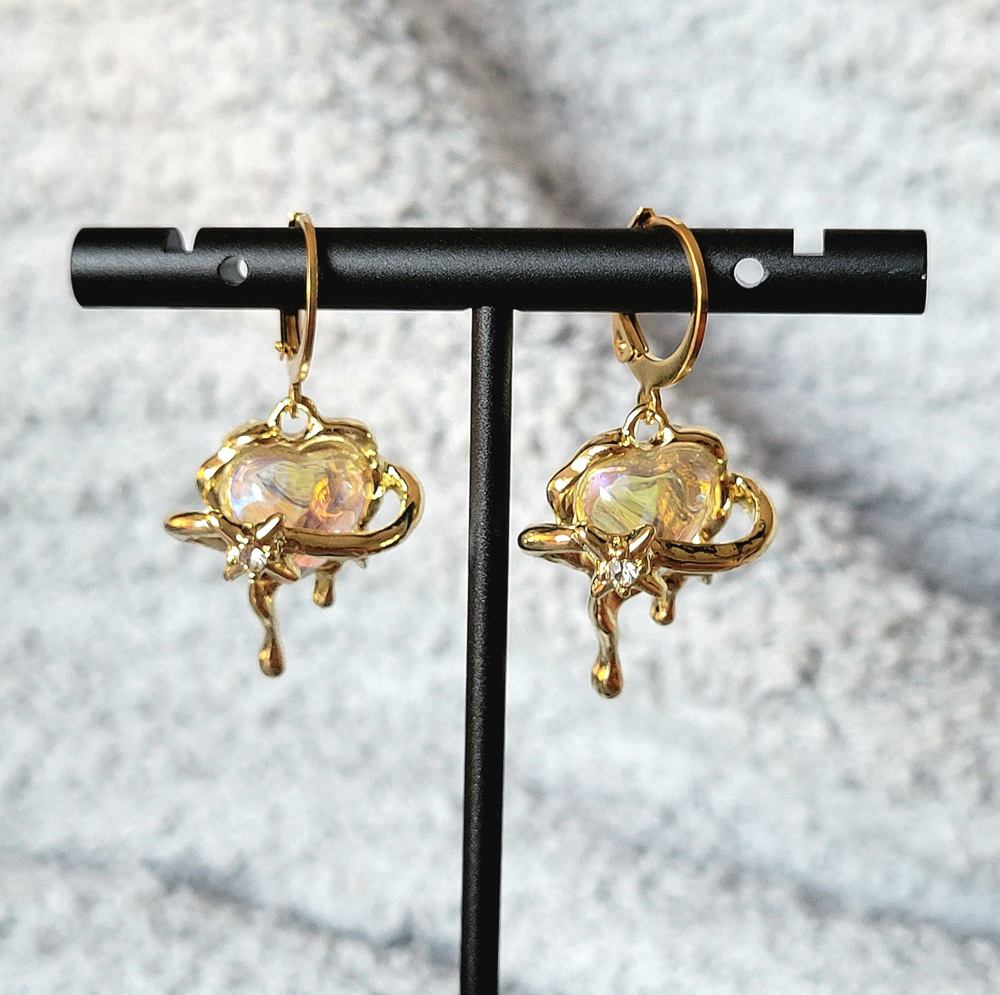 Gold: 18k plated brass leverback hoops with iridescent clear/pink heart surrounded by melting gold.