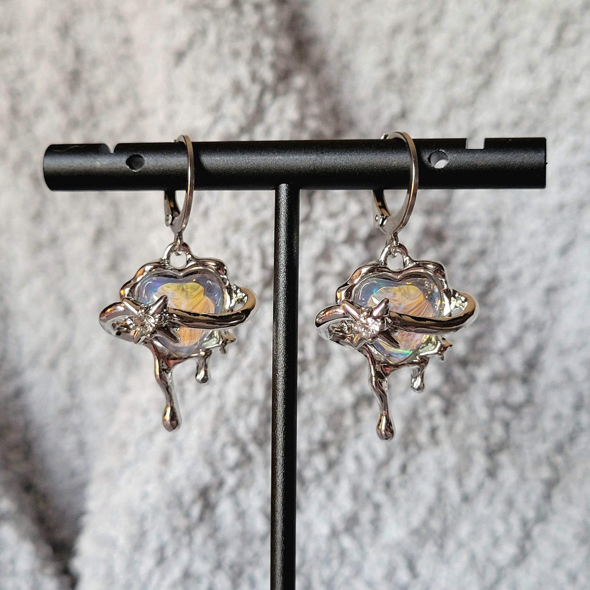 Silver: Stainless steel leverback hoops with iridescent clear/blue heart surrounded by melting silver.
