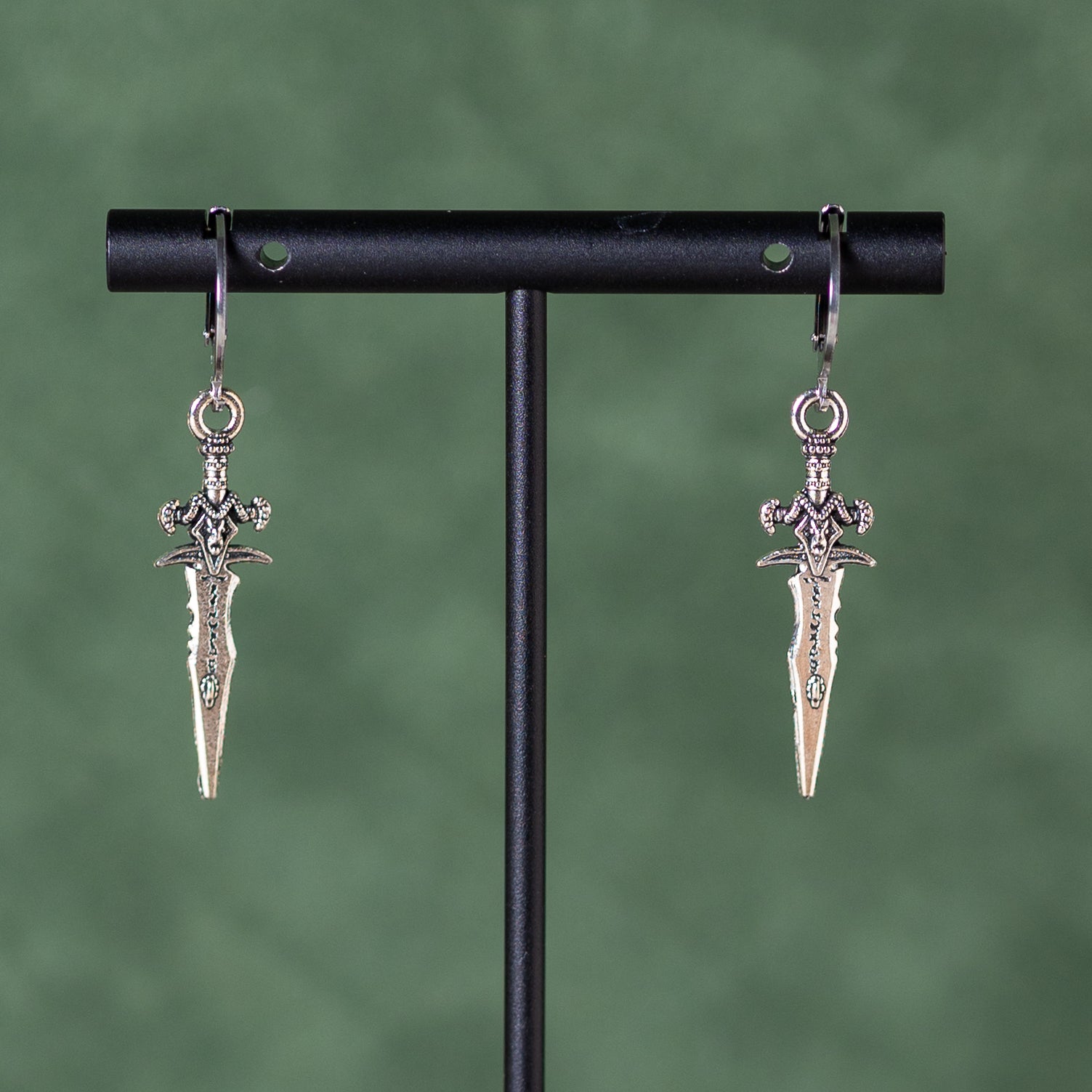 Stainless steel Leverbacks with a small silver sword charm.