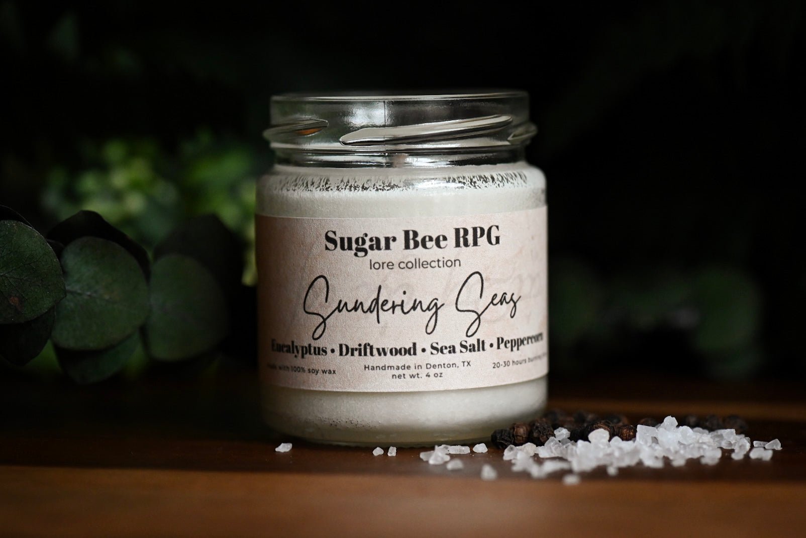 Sundering Seas: Warm sunlight reflecting over white shores, with driftwood sprinkled in sea salt and revitalizing eucalyptus. Fresh top notes of mint and ozone complimented by crushed peppercorn, with middle-earth notes of eucalyptus and greenery atop waves of sea salt and sandalwood.
