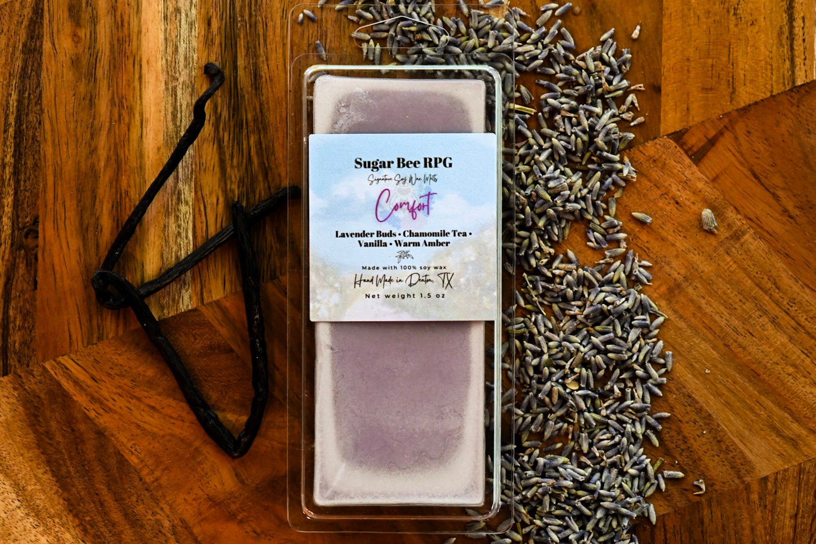 Comfort: The scent of settling into a warm vanilla bubble bath with a hot cup of lavender chamomile herbal tea in your hands. Calming top notes of lavender, chamomile, and amber, with lasting bottom notes of sweet vanilla.